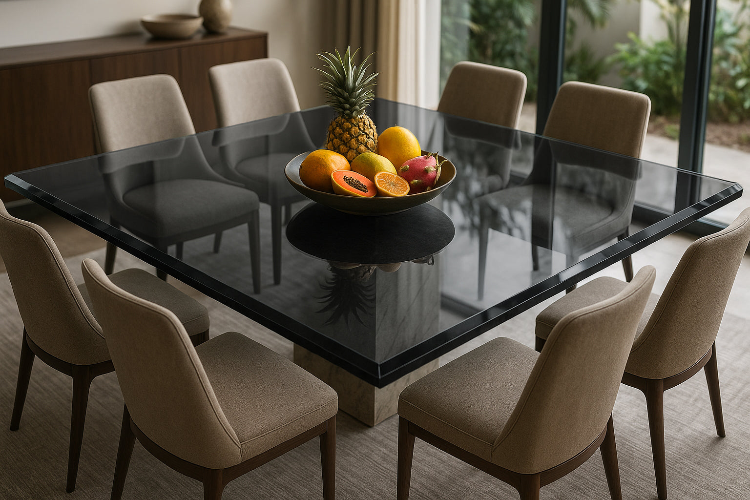 Haz de cualquier mesa un punto focal de tu espacio con esta cubierta cuadrada de vidrio ahumado templado.