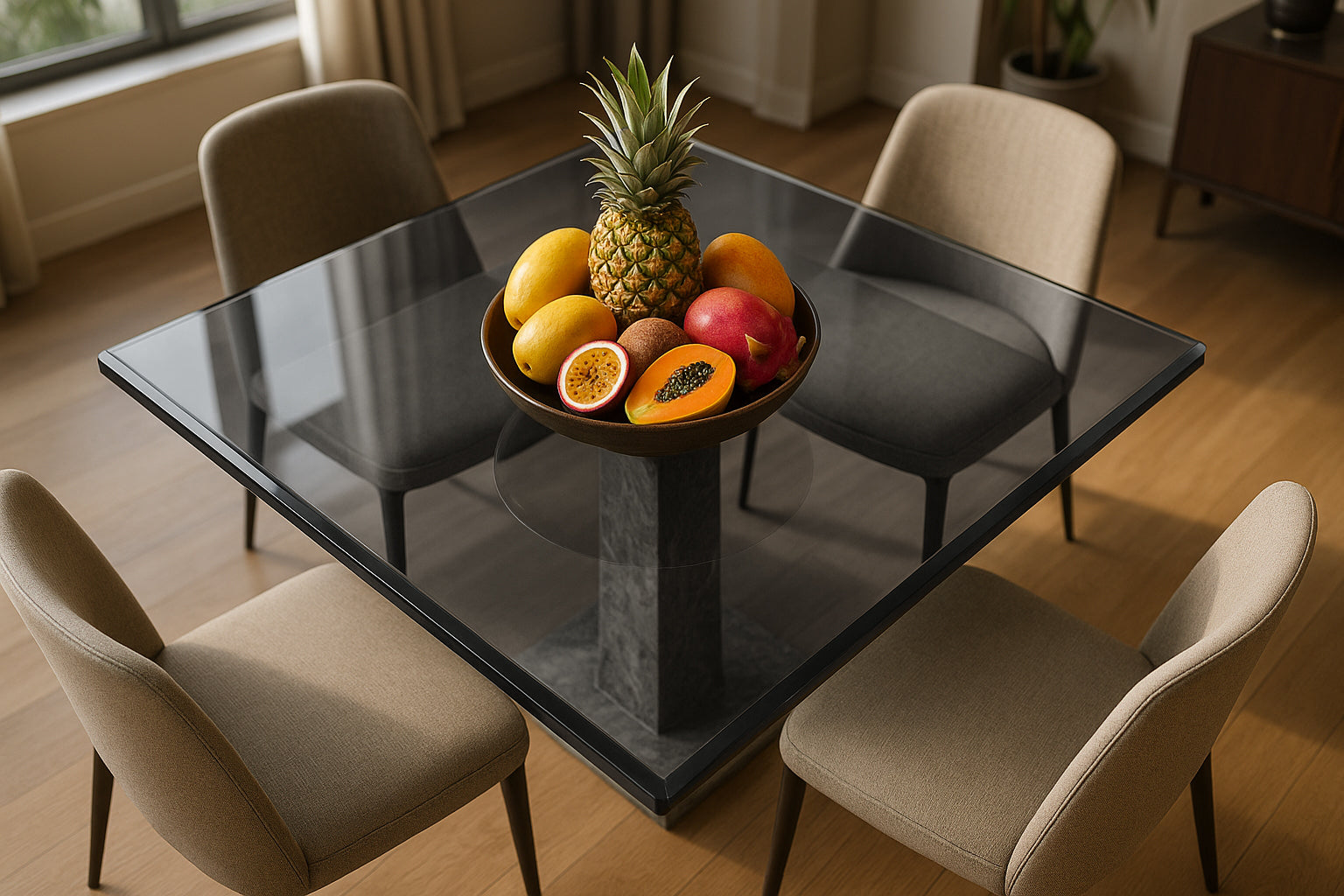 Haz de cualquier mesa un punto focal de tu espacio con esta cubierta cuadrada de vidrio ahumado templado.